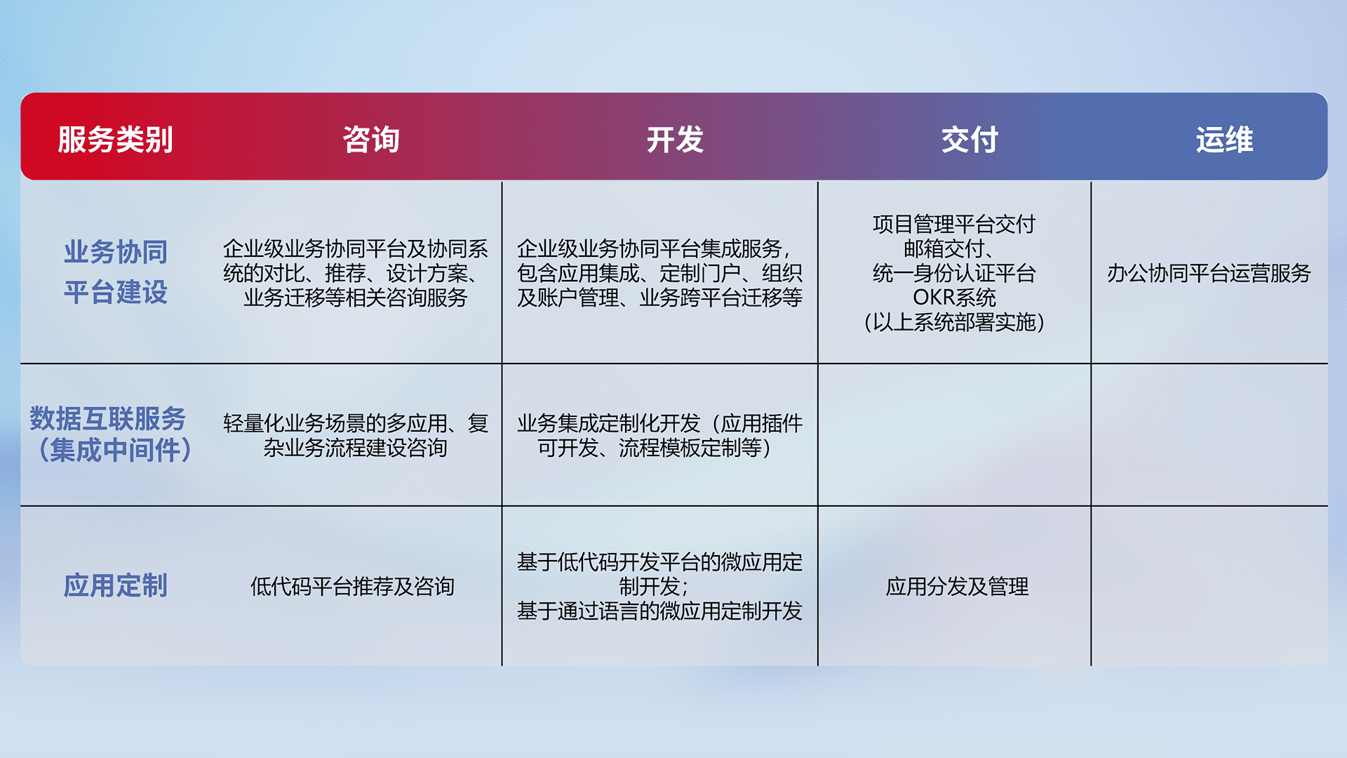 针对钉钉、、、企微、、、IDaas等平台级产品提供产品的规划、、方案、、交付、、、、定制化开发等服务,,实现如统一协同办公、、智能客户服务、、、、混合会议管理、、、、智能数据查询、、等业务场景,,,,实现数字化转型。。