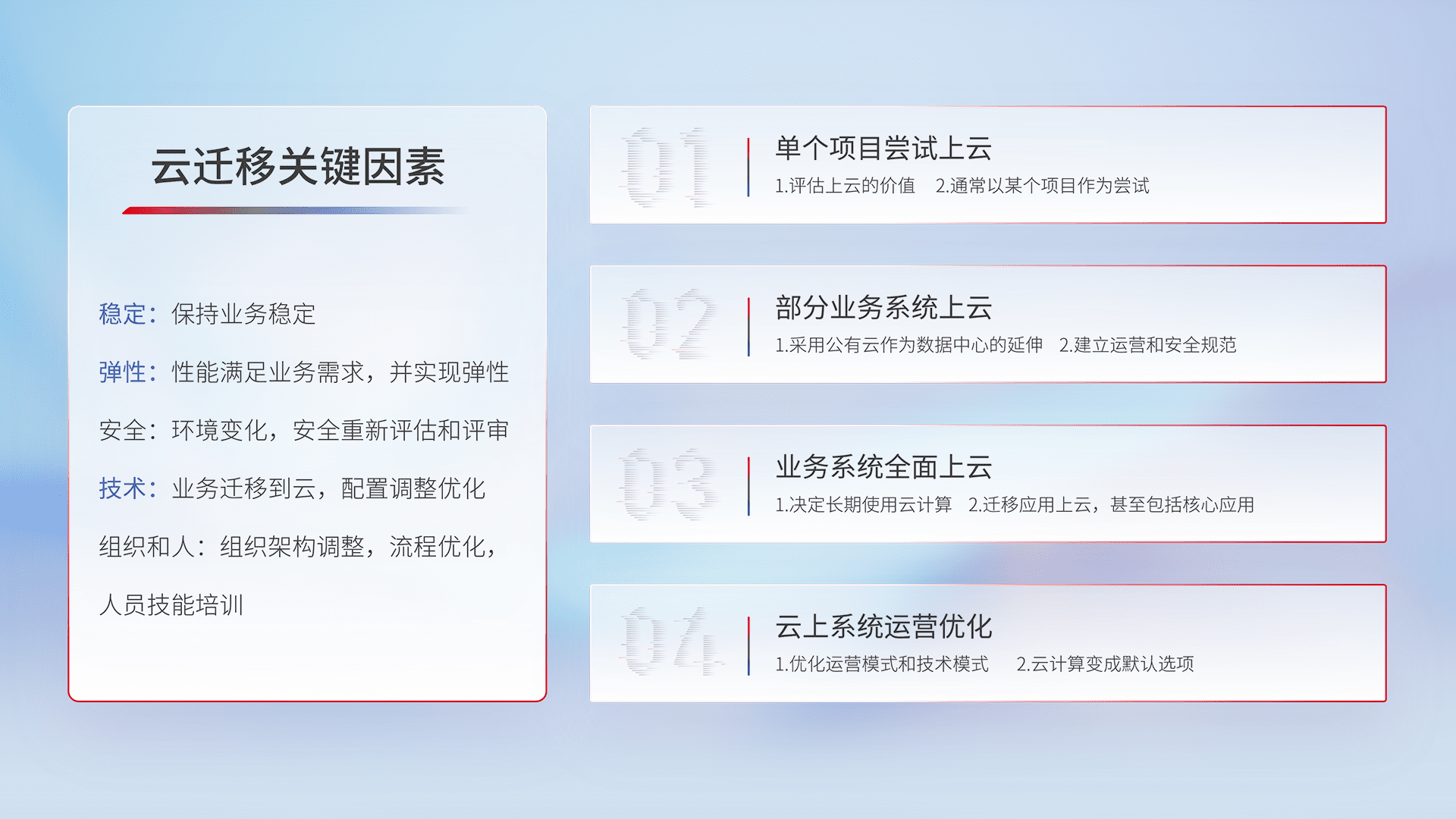 结合实际业务,,从规划设计、、云平台选型、、云原生改造、、、数据迁移、、、集成交付,,,,迁移全过程为客户识别最佳上云路径,,,做好风险识别管理,,设计网络架构、、、、身份权限、、、、安全审计合规、、、、操作审计、、日志审计、、、、监控告警策略、、、多站点容灾设计等,,,,对云上基础设施进行整体规划,,提升IT治理水平,,,以满足弹性、、、高可用、、、、高性能的需求。。