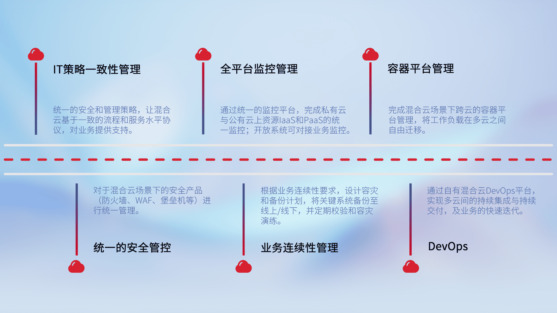 通过多云纳管,,,,以统一的资源数据模型把客户的云资源进行抽象和封装,,,进而实现对多云资源的统一操作,,,保障云资源管理的可靠性、、稳定性与可用性。。量身定制化运维内容,,,,配置、、、、开发运维、、补丁管理、、、、备份、、、、监控、、、认证和访问管理、、、审计和日常巡检等,,保障在用云过程中的可靠度,,稳定度以及高可用率。。。